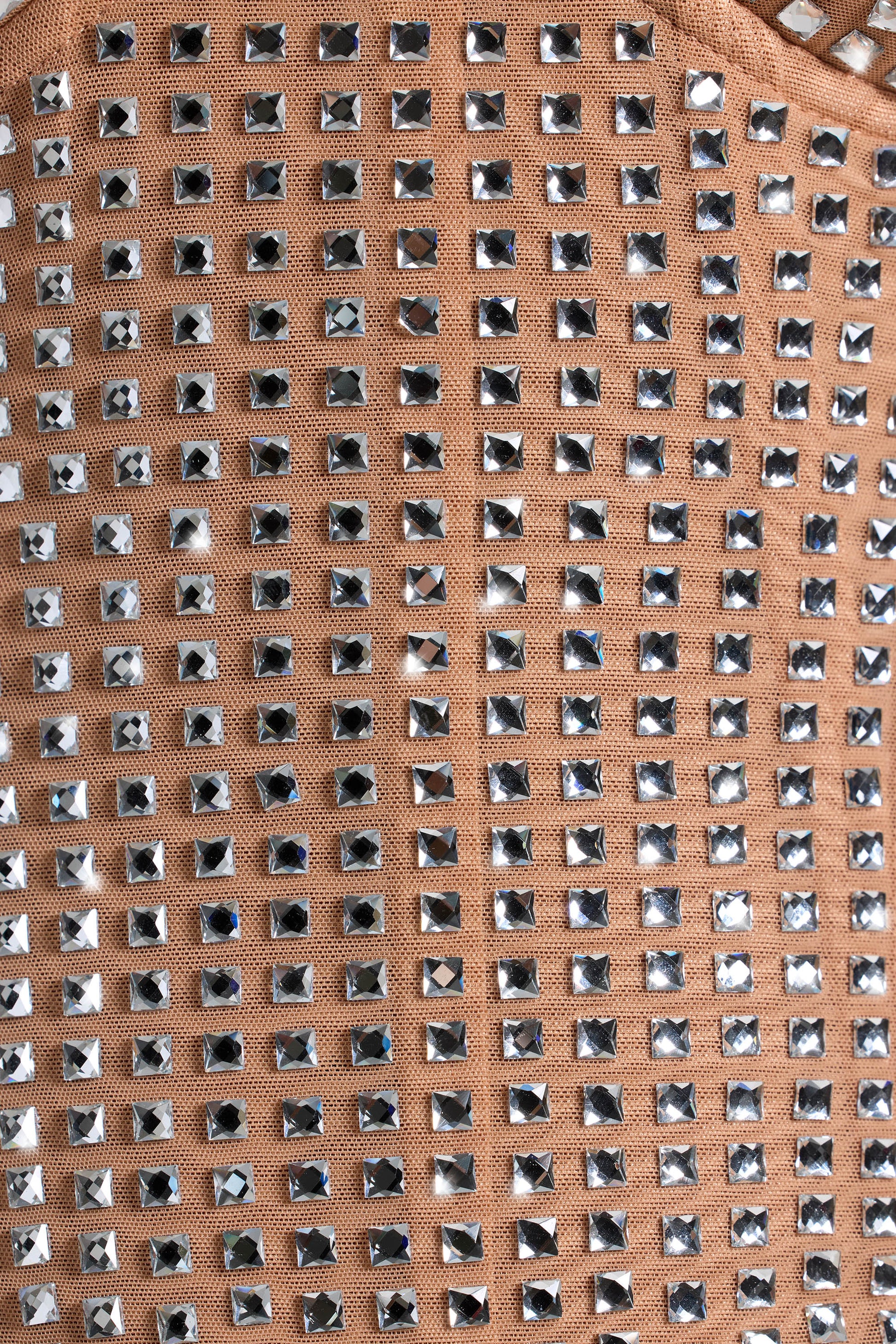 Adorned with shimmering HOTFIX embellishments that catch the light from every angle, this dress was made for the spotlight. The asymmetric draped skirt adds a modern, elegant twist — balancing sophistication with a daring edge.