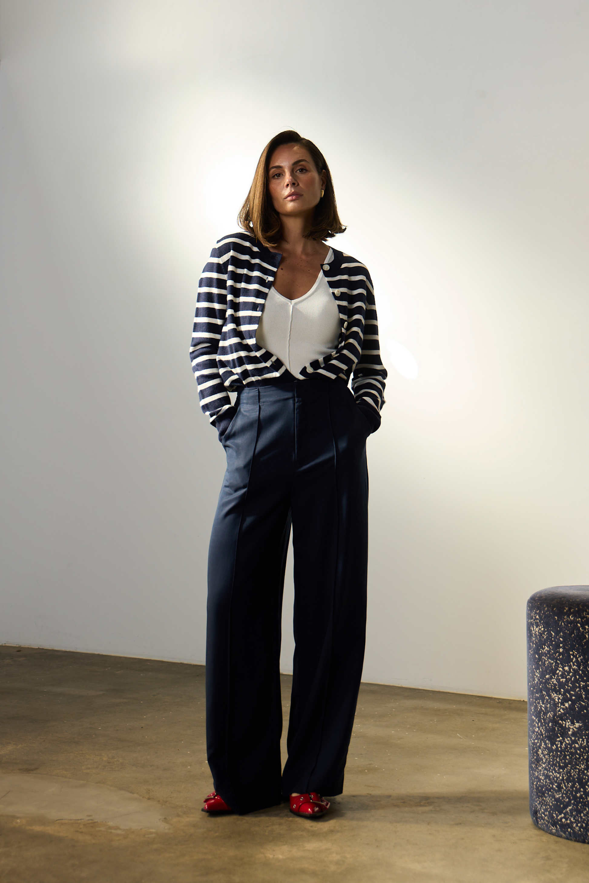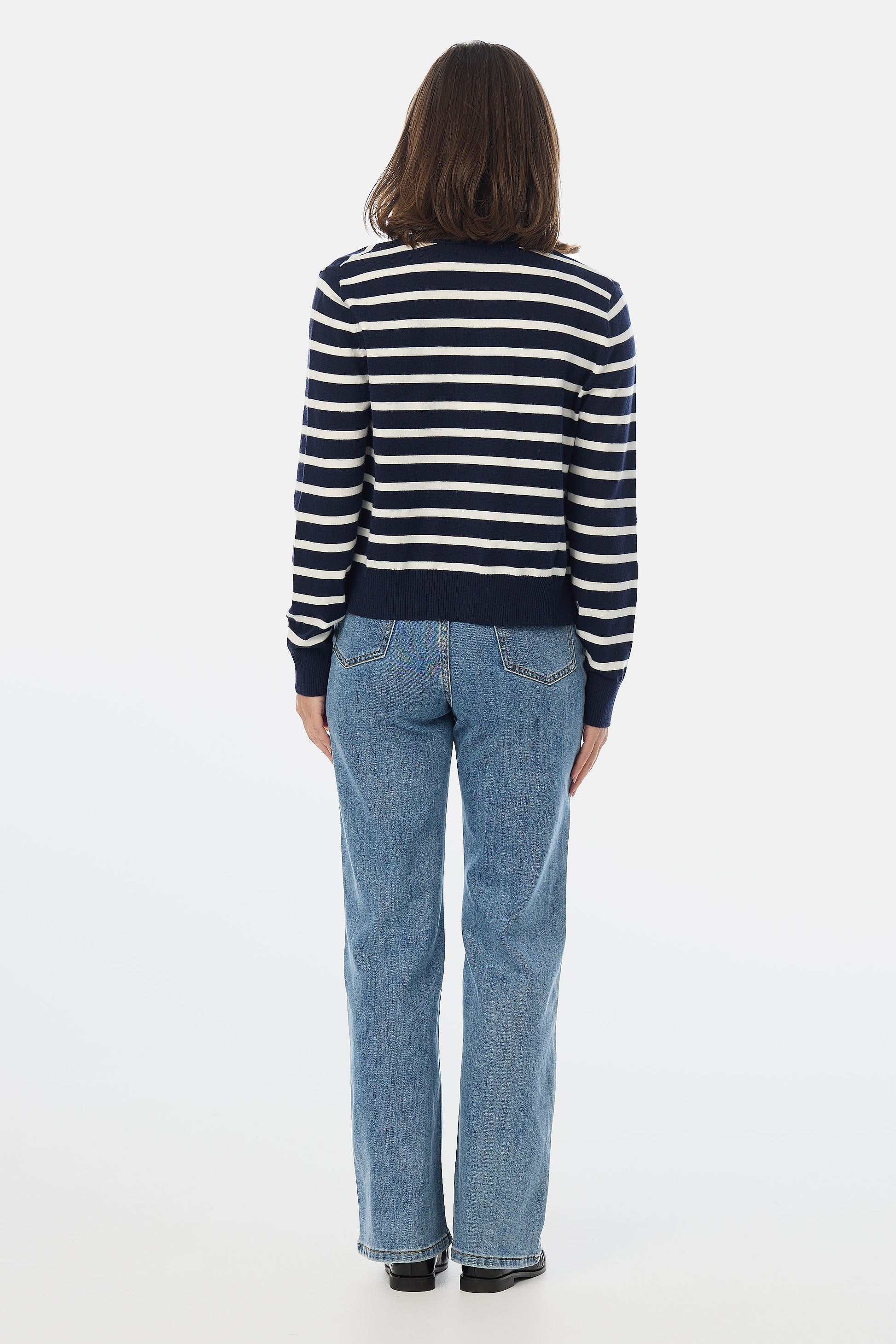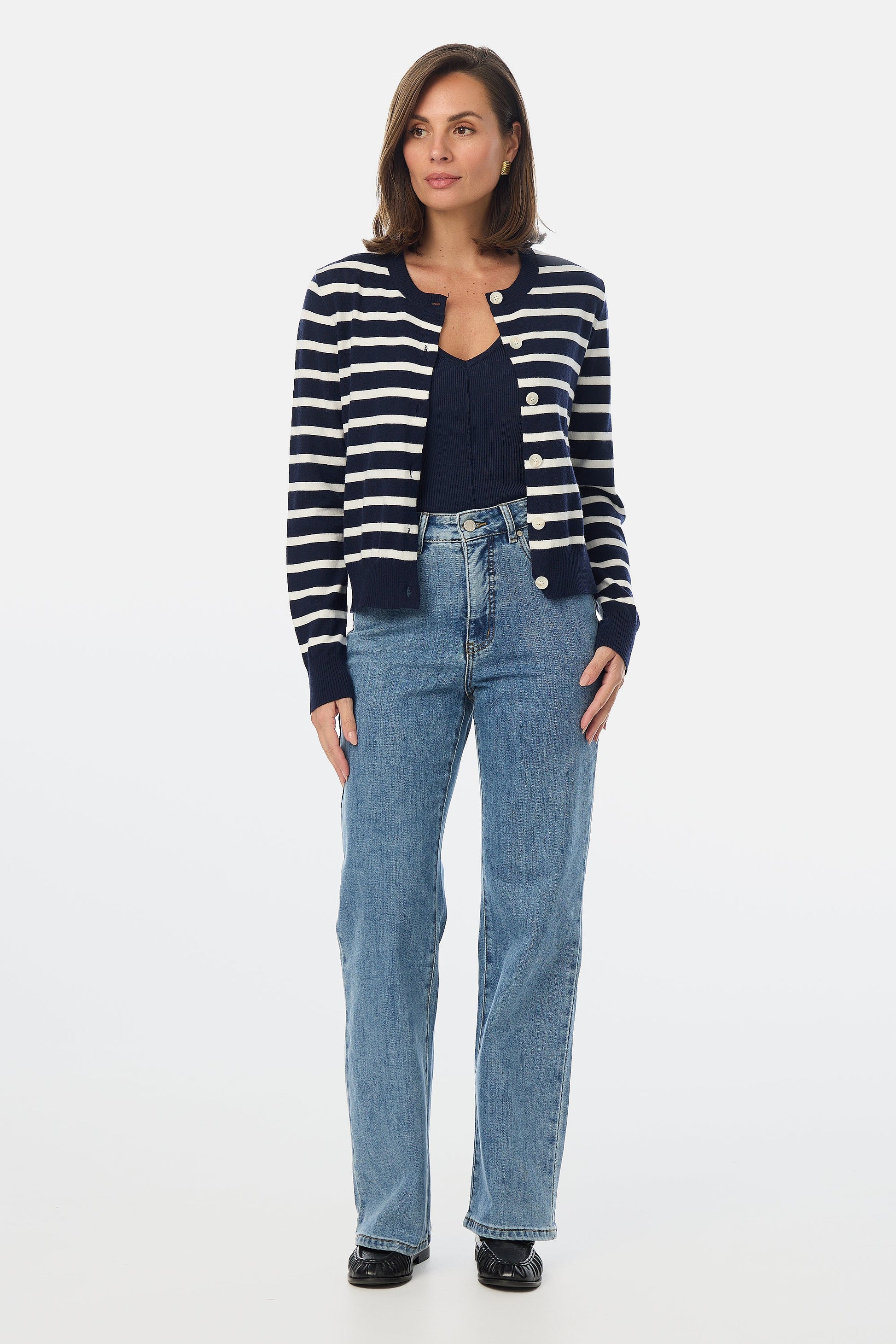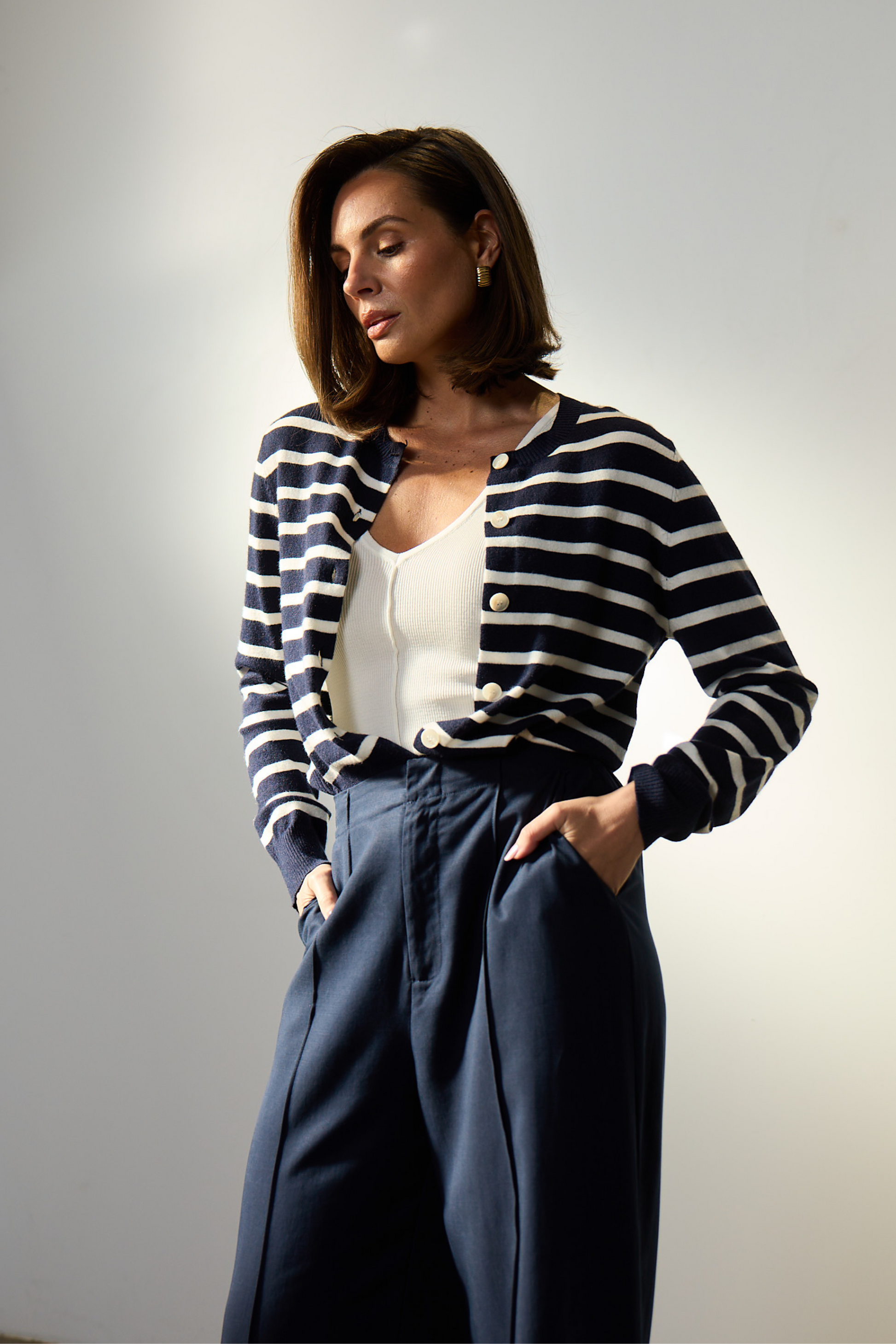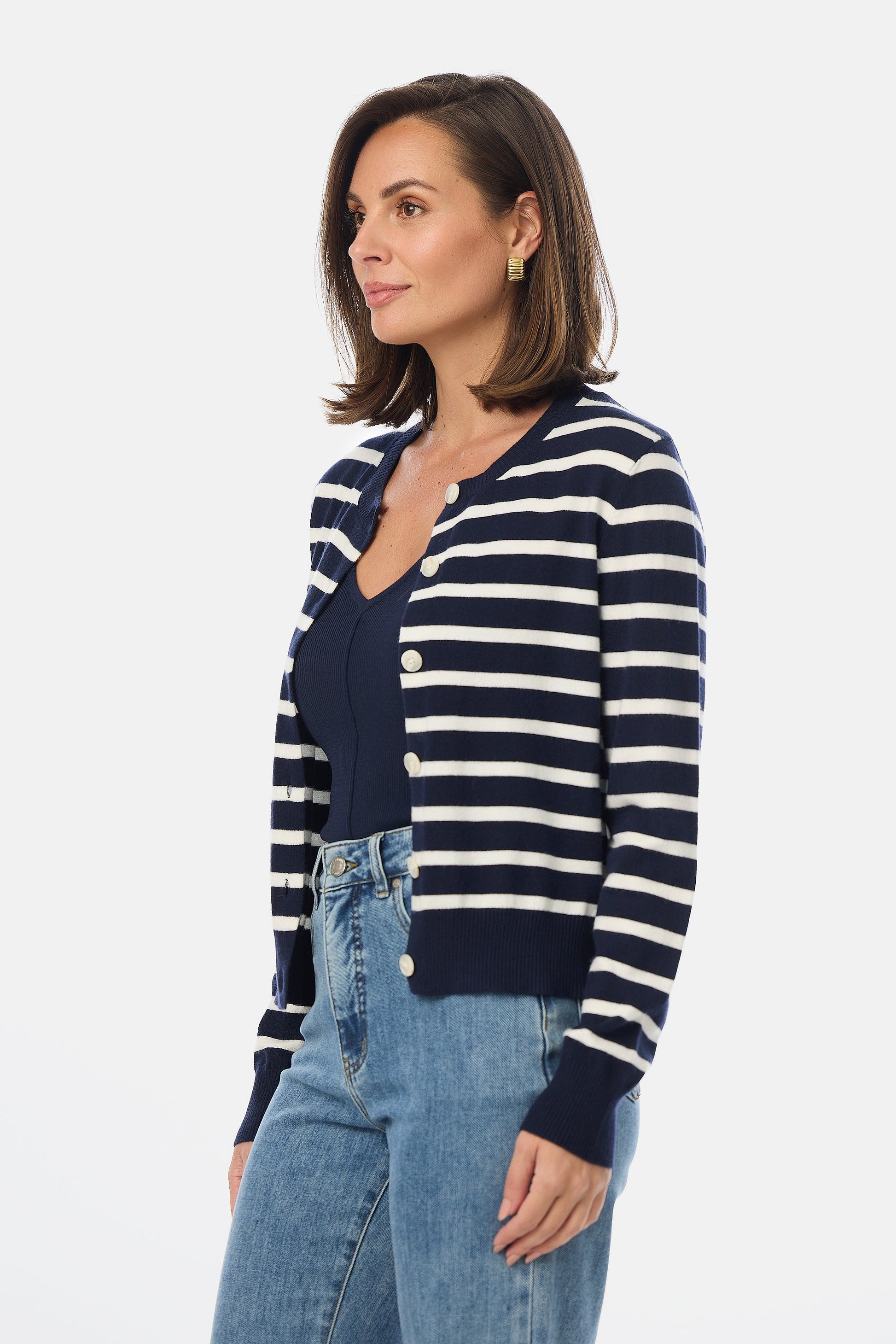 Classic navy-and-white stripes meet effortless comfort in this lightweight knit cardigan. Finished with tortoiseshell buttons, ribbed trims, and a soft mid-weight feel â perfect worn buttoned up or layered over your everyday staples.