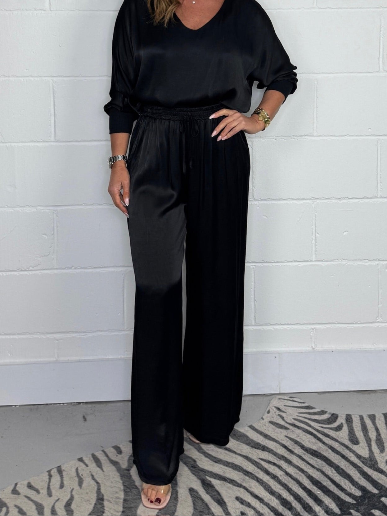 • Tummy-Flattering Design: The wide-leg pants with an elastic waistband and the slim-fit blouse work together to create a smooth and flattering silhouette that comfortably covers the midsection.