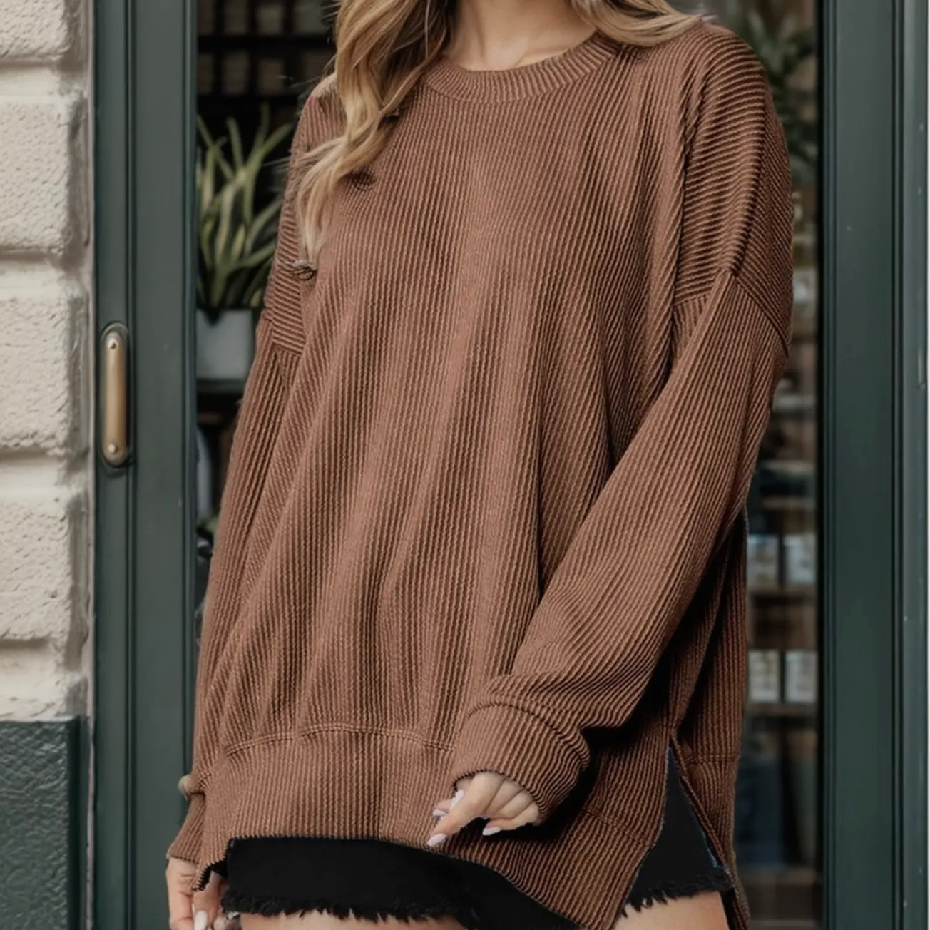 Effortlessly cozy and chic, this oversized ribbed sweater is perfect for relaxed days or casual outings. Designed with a loose fit, drop shoulders, and a soft knit texture, it offers all-day comfort while keeping your look stylishly laid-back. Pair it with jeans or shorts for an easy, everyday outfit.