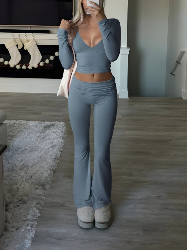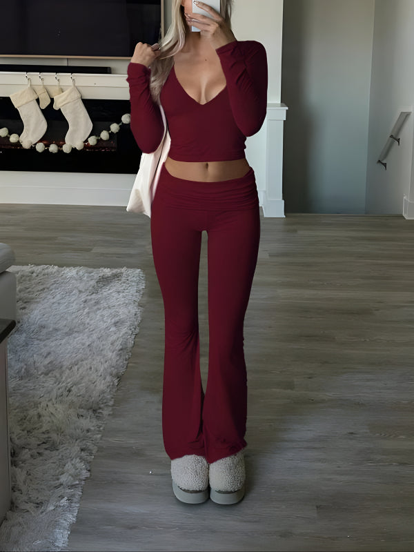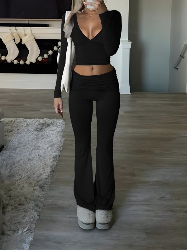 The Ruched Design Two-Piece Outfit combines style and comfort with its deep V-neck crop top that creates a flattering silhouette and a ruched design for a modern, figure-enhancing touch. Paired with flared bell-bottom pants, it offers a balanced look, superb for colder months. Crafted from machine-washable fabric, it ensures easy maintenance while remaining stylish for daily activities.