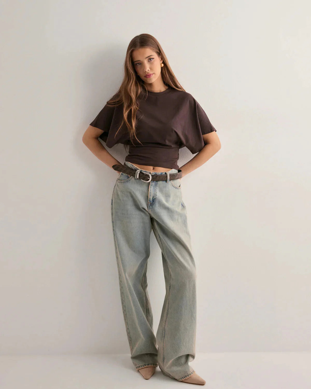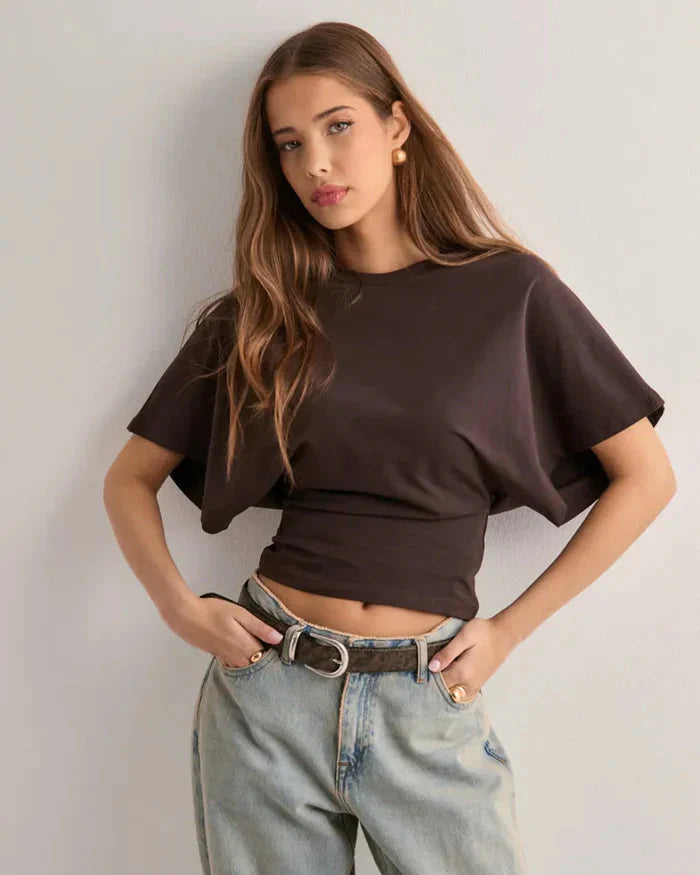 Trendy T-shirt with Wide Sleeves – A timeless essential for any wardrobe. This stylish T-shirt effortlessly combines comfort and elegance. Made from soft, breathable fabric, it offers a flattering fit and a modern look. Perfect for pairing with both casual and chic outfits.