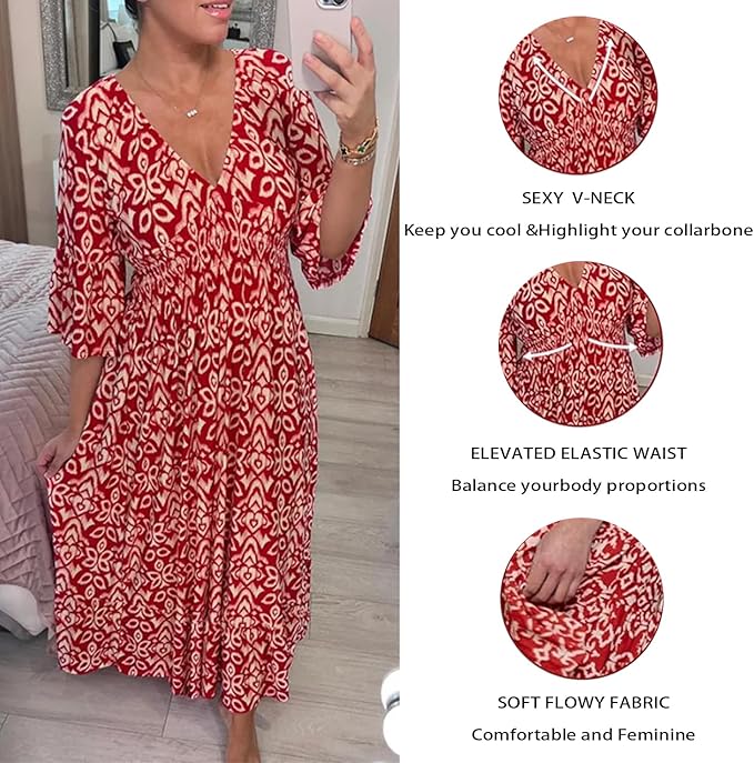 • Effortless Style: A V-neck and bohemian print for a chic, elongated look.