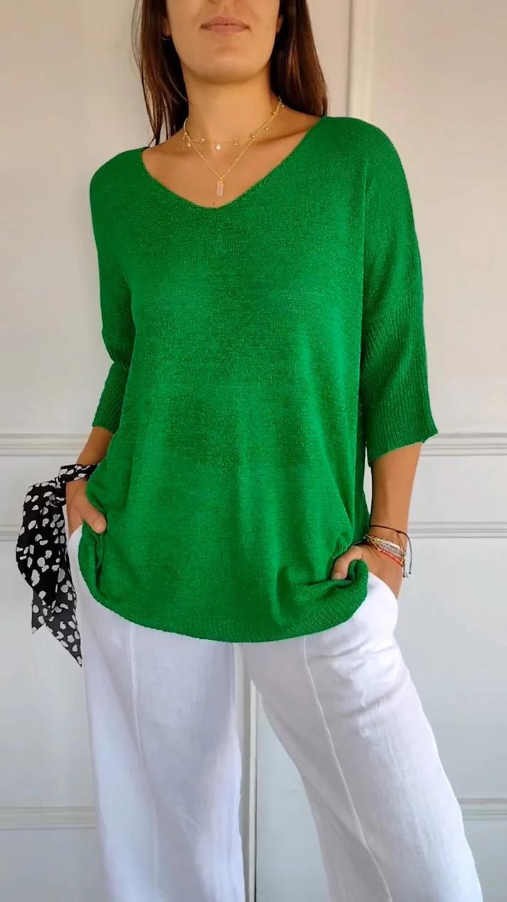 Discover the perfect blend of comfort and style with the V-neck Knitted Sweater. This relaxed pullover with 3/4 sleeves is ideal for any occasion, from casual days to more dressed-up moments. Made from soft, breathable materials, this sweater offers a comfortable fit and an effortless, stylish look.
