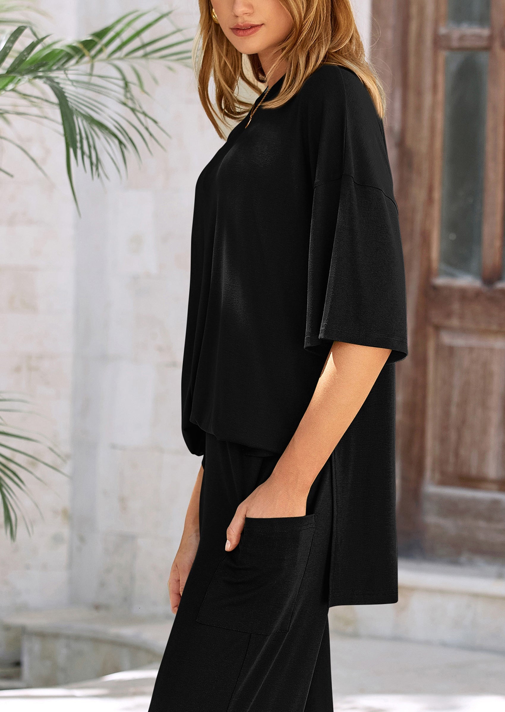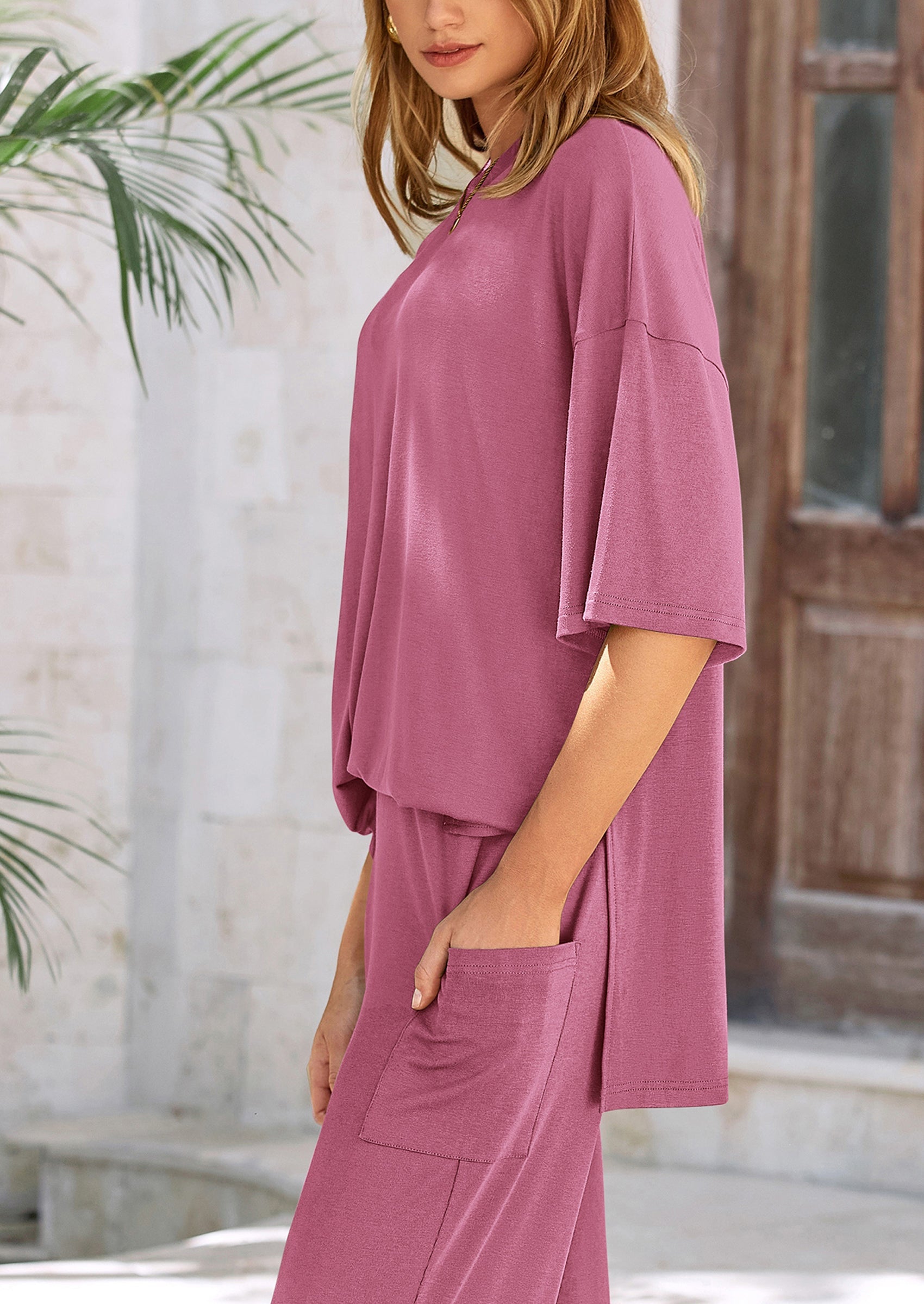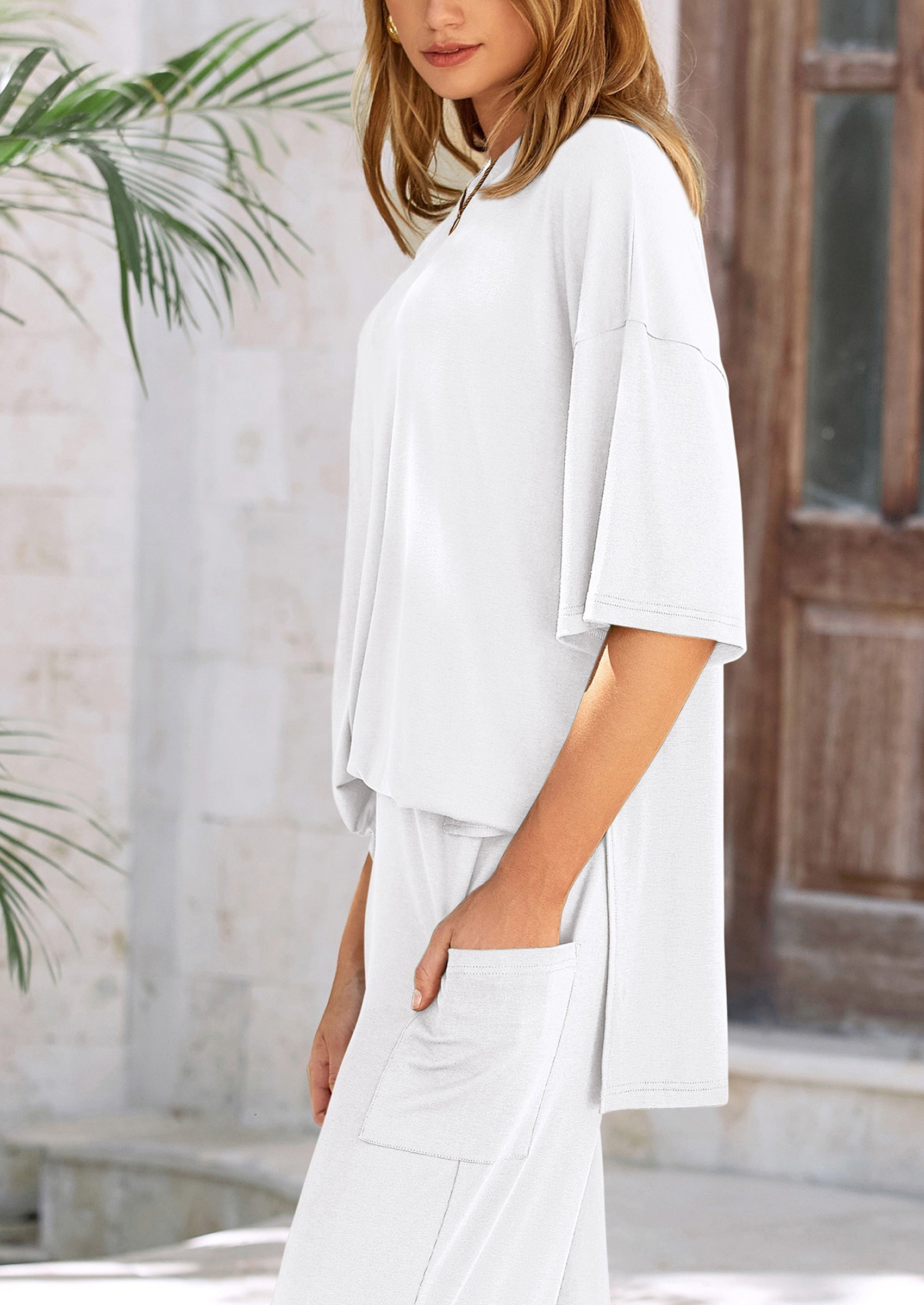 Discover the ultimate in effortless style with our Women's Two-Piece Pullover & Pants Lounge Set. This two-piece ensemble is designed to be your instant outfit, pairing a comfortable, short-sleeved pullover top with relaxed wide-leg pants. Made from a wonderfully soft and lightweight knit fabric, this set feels as good as it looks. The top features a breezy, oversized fit, while the high-waisted pants offer a flattering silhouette with convenient side pockets. Wear them together for a polished and comfortable look perfect for travel, lounging, or running errands. For even more versatility, each piece can be worn as a separate, offering an endless styling possibilities.